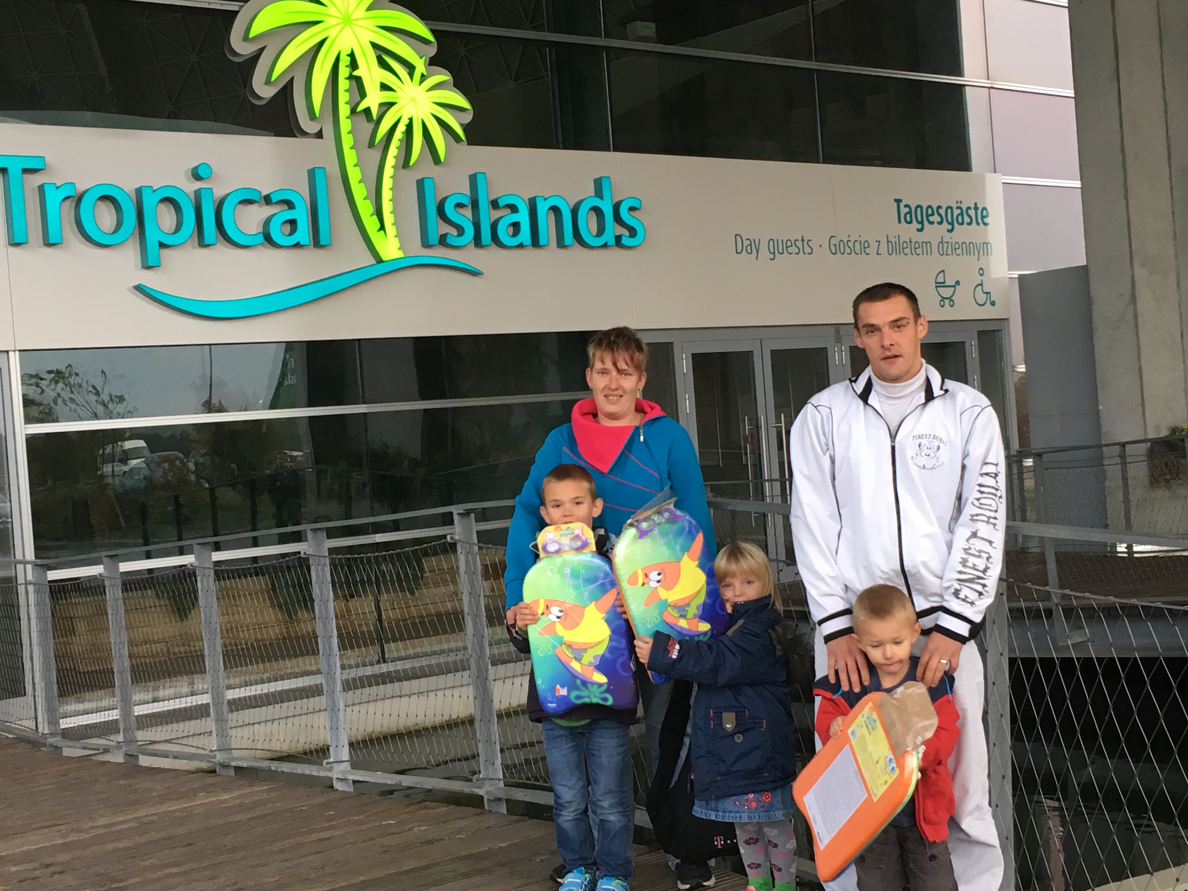 Die ganze Familie wurde mit einem großen Auto abgeholt und für einen Tag ins Tropical Island eingeladen. Die Aufregung und Freude war groß, als die Familie das Innenleben der riesigen Halle in Augenschein nehmen konnte. Ein kleines Inselparadies mit allem drum und dran und das einen ganzen Tag lang. Damit auch Pommes und Eis mit drin sein konnten, gab es noch einen Verpflegungsgutschein obendrauf.